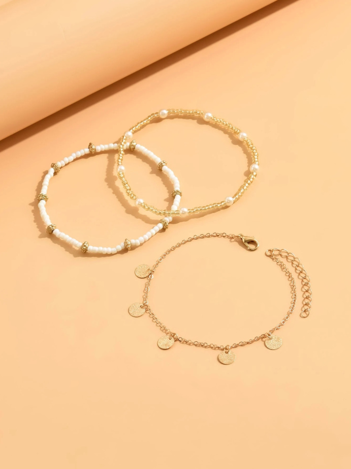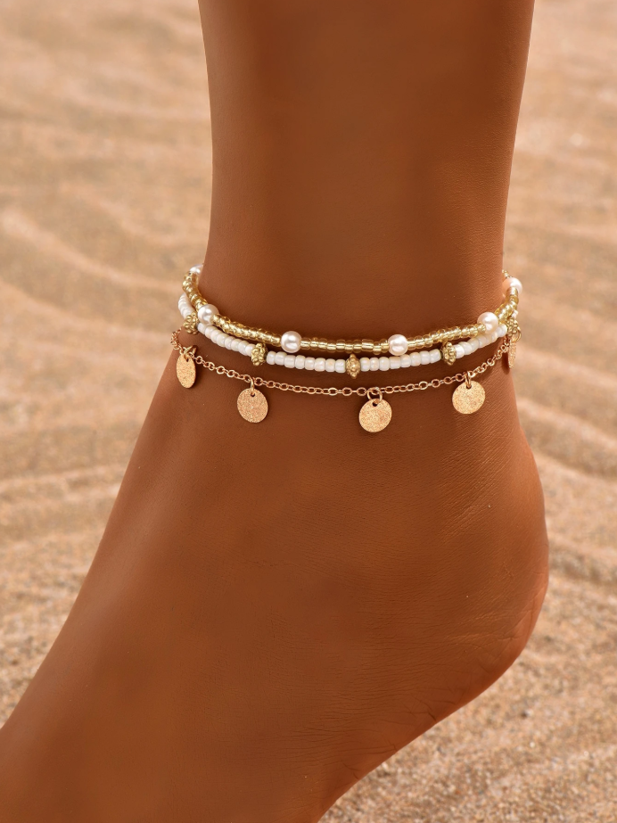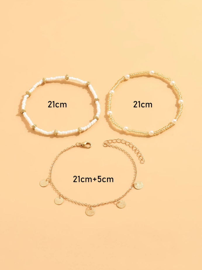 Adorn your ankles with golden glow and coastal charm. This 3-piece set features delicate beading, shimmering discs, and layered textures — the perfect boho accent for barefoot beach days, summer sandals, and dreamy sunsets.