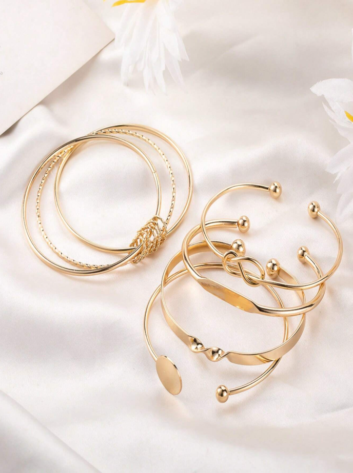 | Bracelets (x5) | Open Cuff / Bangle | Adjustable, fits most | Gold |