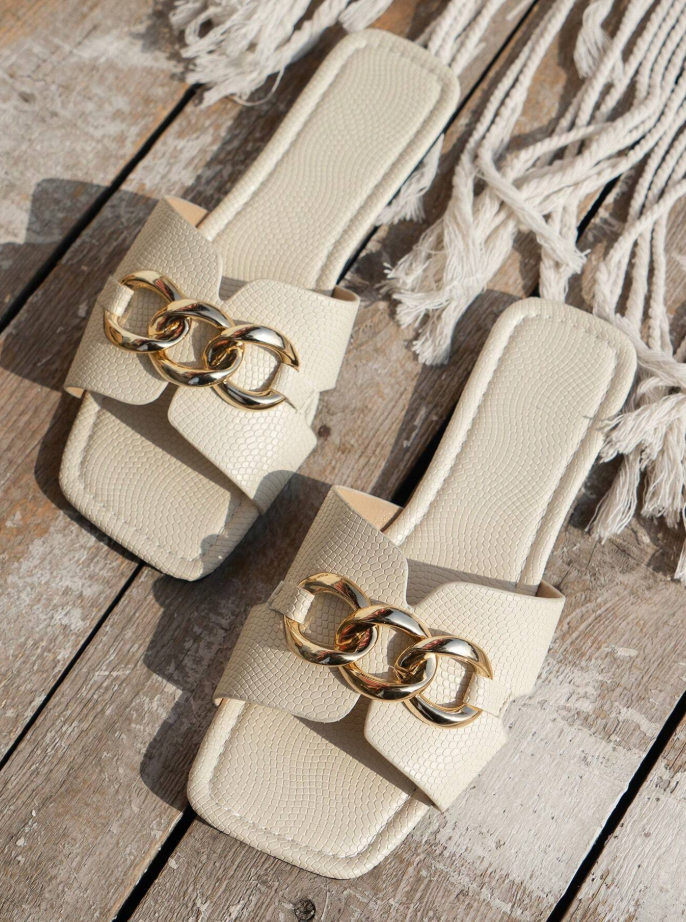Turn every summer step into a style statement with these beige open-toe slides. Featuring a bold gold chain and textured finish, they blend elegance with casual ease — perfect for fashion-forward days.
