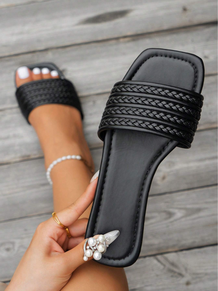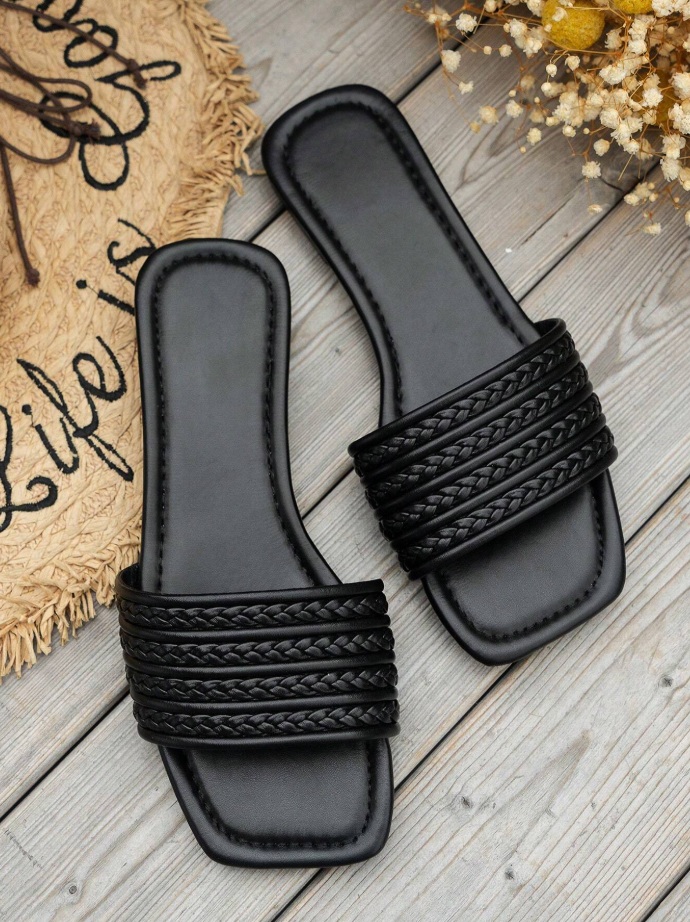 Step into effortless style with these black braided flat sandals. The square toe and textured strap add bold attitude to your summer look, while the slip-on design makes them your new go-to for every sunny day.