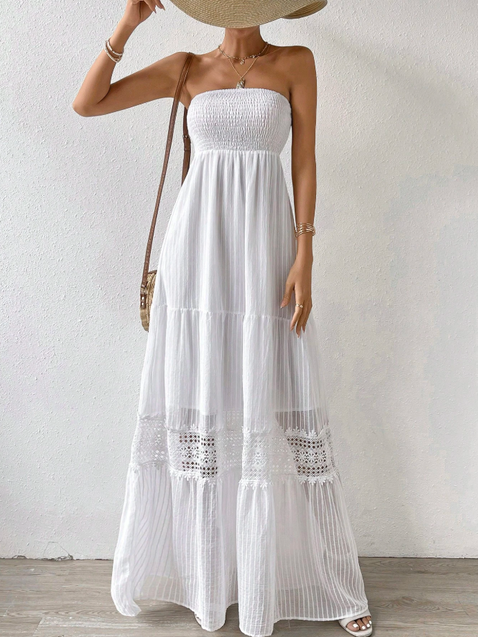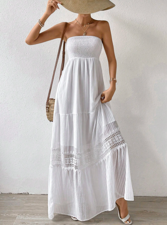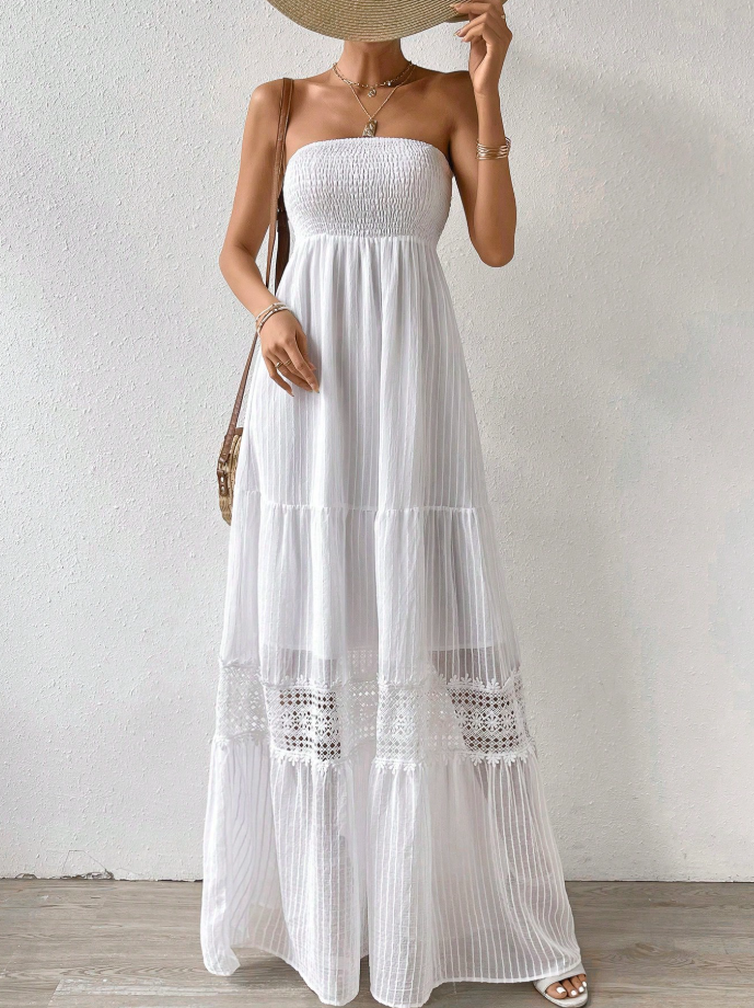 Float through summer days in this effortlessly chic white strapless maxi dress. Its lightweight, tiered design with delicate lace details evokes breezy coastal vibes and timeless elegance. The smocked bodice provides comfort and flattering shape, while the flowing skirt moves beautifully with every step.