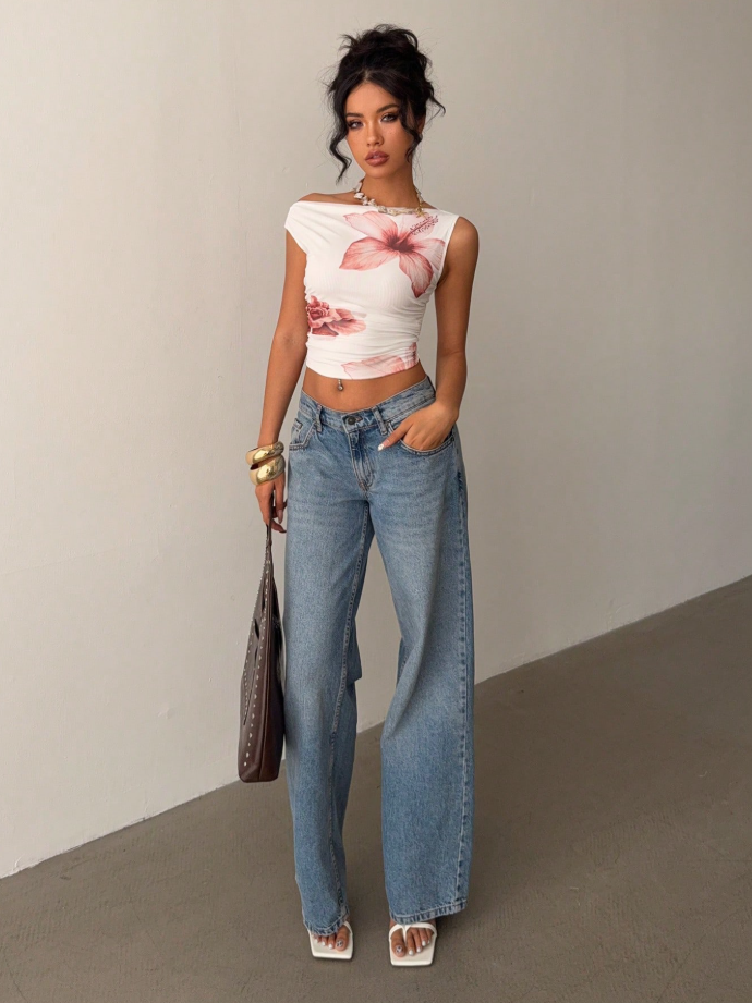 Pair with high-rise wide-leg jeans and square-toe heels for that model-off-duty aesthetic. Add small hoop earrings and a messy bun to complete the Y2K fantasy. Great with a mini skirt, too — just add lip gloss.
