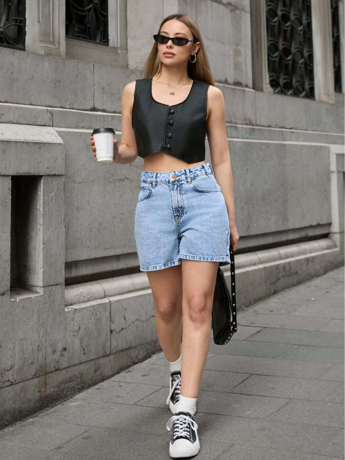 Pair them with a black crop vest and chunky Converse for that model-off-duty vibe, or go full feminine with a floral blouse and espadrilles. Add a crossbody bag and sunglasses — you're ready for the spotlight.