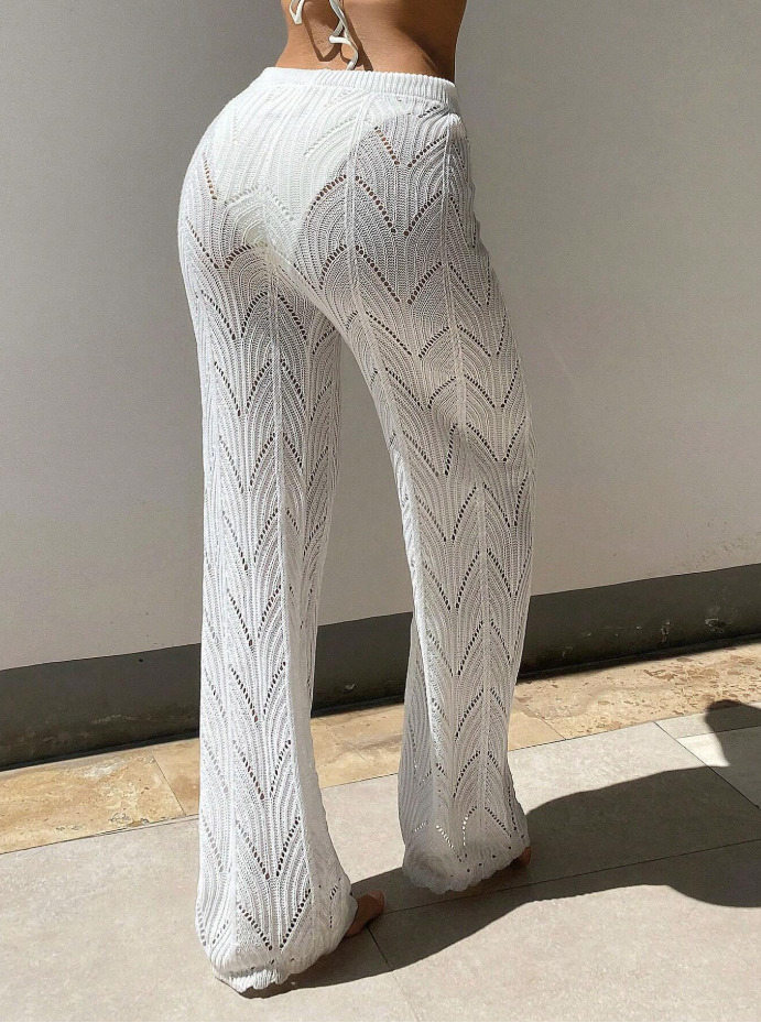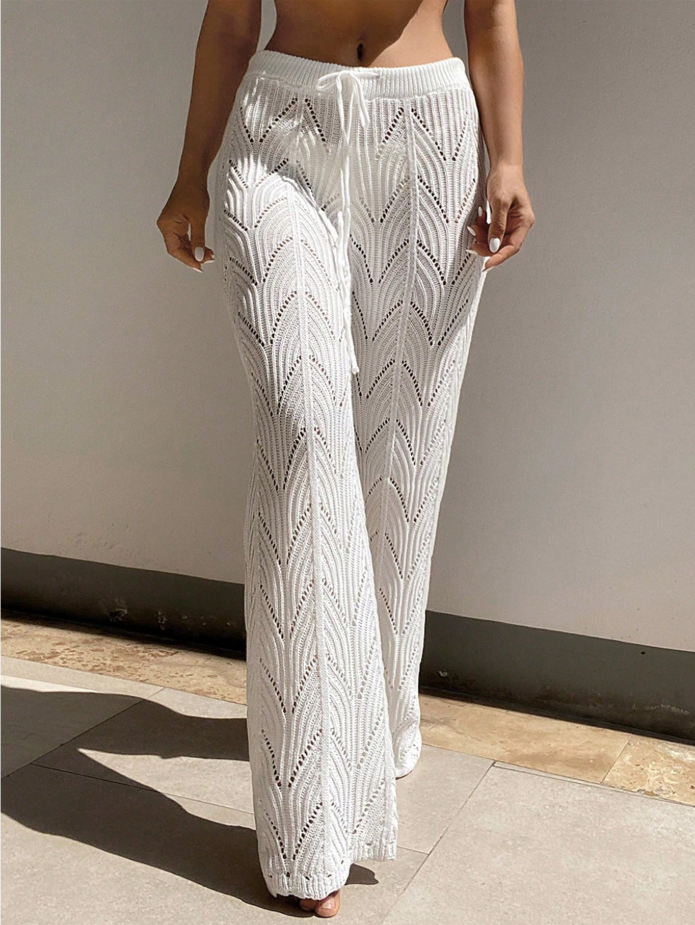 Elevate your beach style with the Pointeille Knit Cover Up Pants! These elegant white knit pants feature a breathable, open-knit design, a comfortable drawstring waist, and a flowing silhouette, perfect for a stylish cover-up over your swimsuit or a lightweight summer outfit.