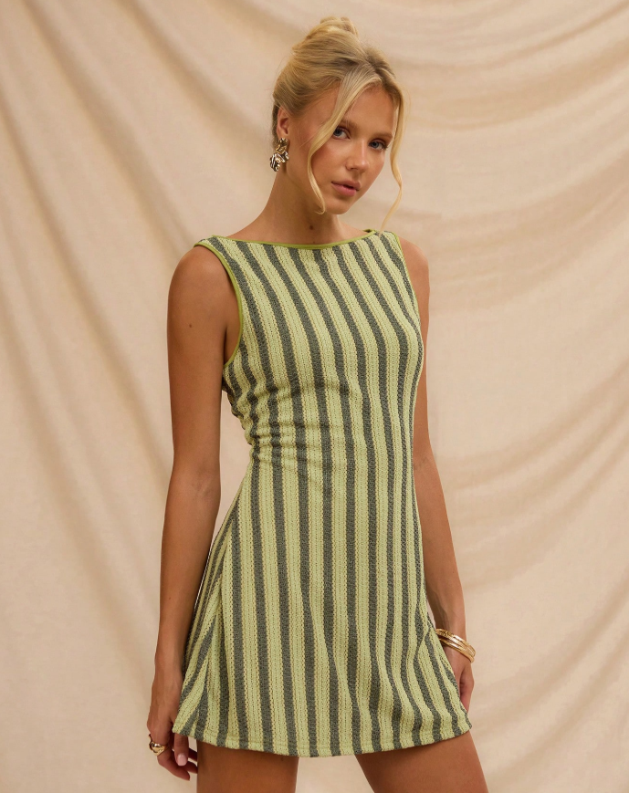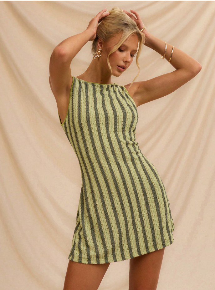 From beaches to backyards, this striped mini dress is your go-to for that effortlessly put-together look. The vertical lines elongate, the knit fabric hugs — and the vibe? 100% carefree with a touch of retro charm.