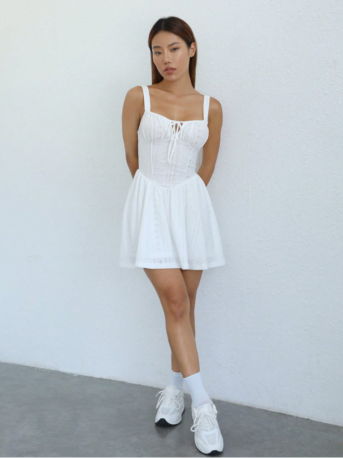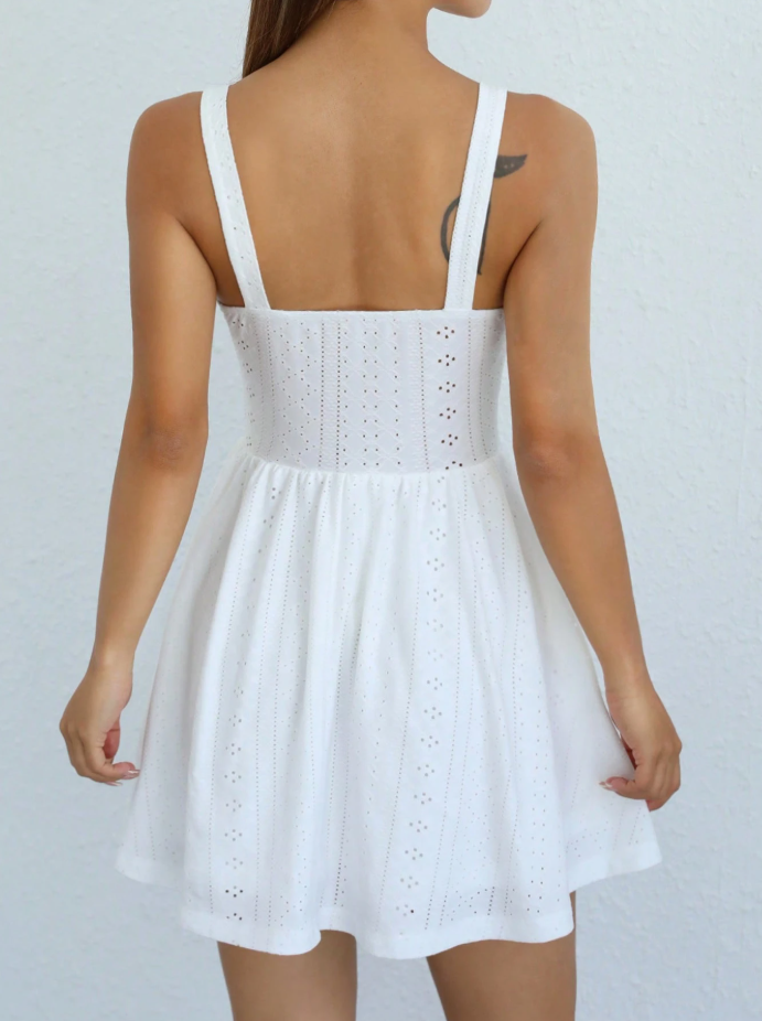 Channel feminine charm and effortless elegance in this white cami dress designed to sculpt your silhouette and brighten your summer wardrobe. With delicate eyelet details and a flattering ruched bust, it’s the kind of dress that turns a walk into a moment and a day into a story.