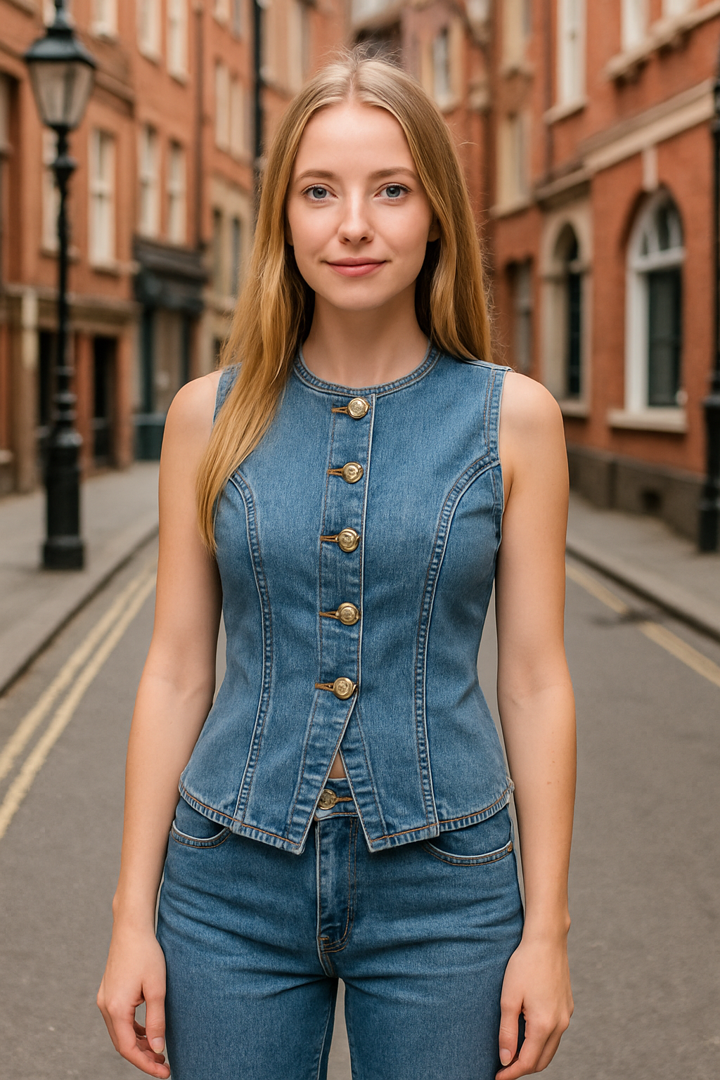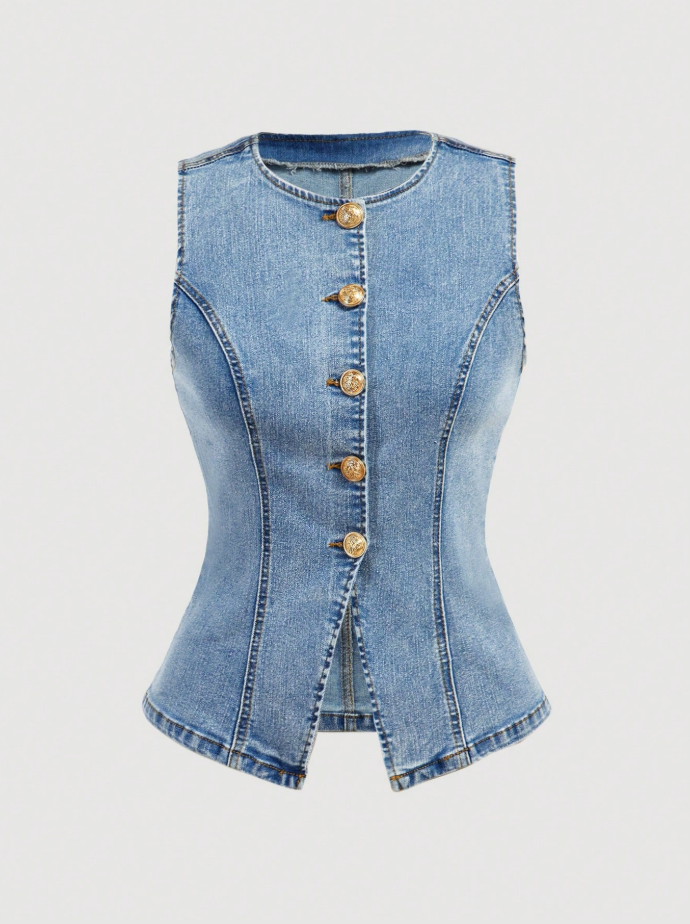 • Features: Washed denim, button front, sleeveless, stretch fit.
